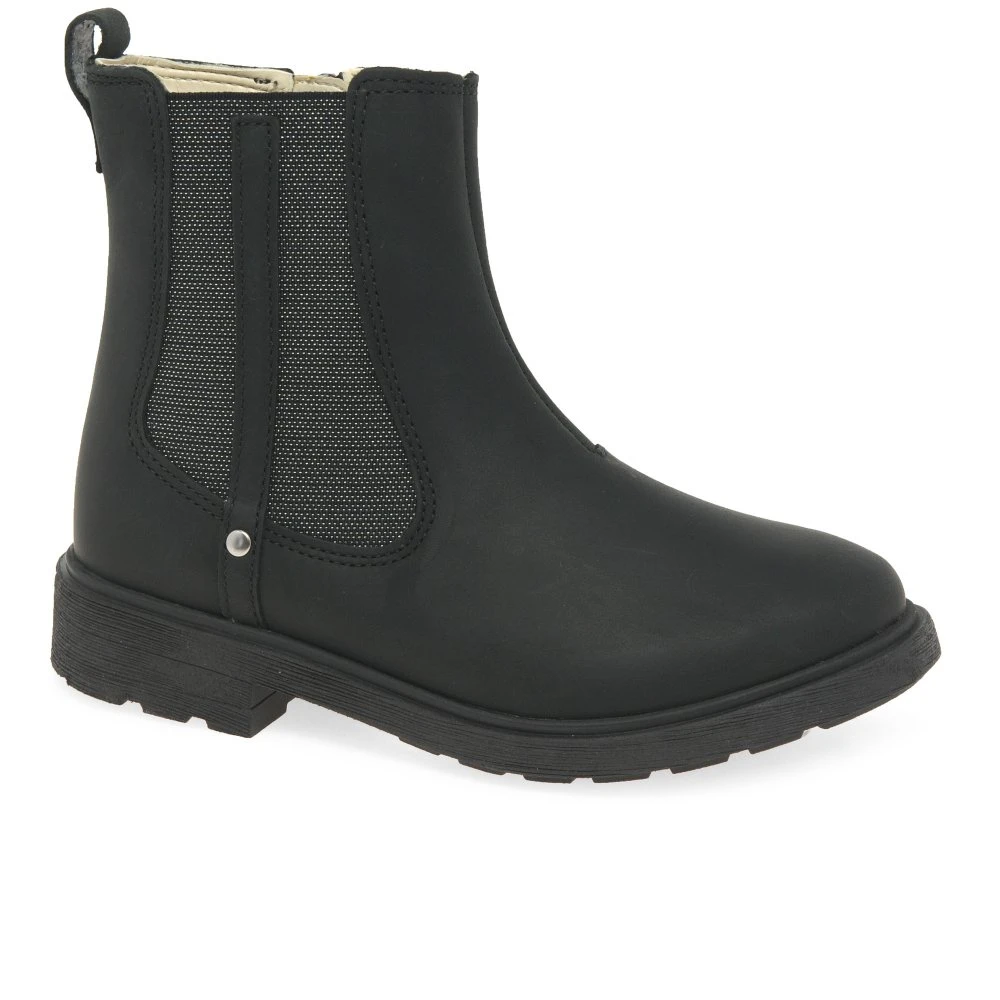 A classic Chelsea boot, the Clarks Astrol Orin K girl’s boots are perfect for school or play. Featuring a secure zip fastening, a side gusset helps with flexibility around the ankle while a durable rubber sole aids grip and balance. Textile linings keep feet feeling warm, and the smooth leather uppers are finished with a stud trim for detail.