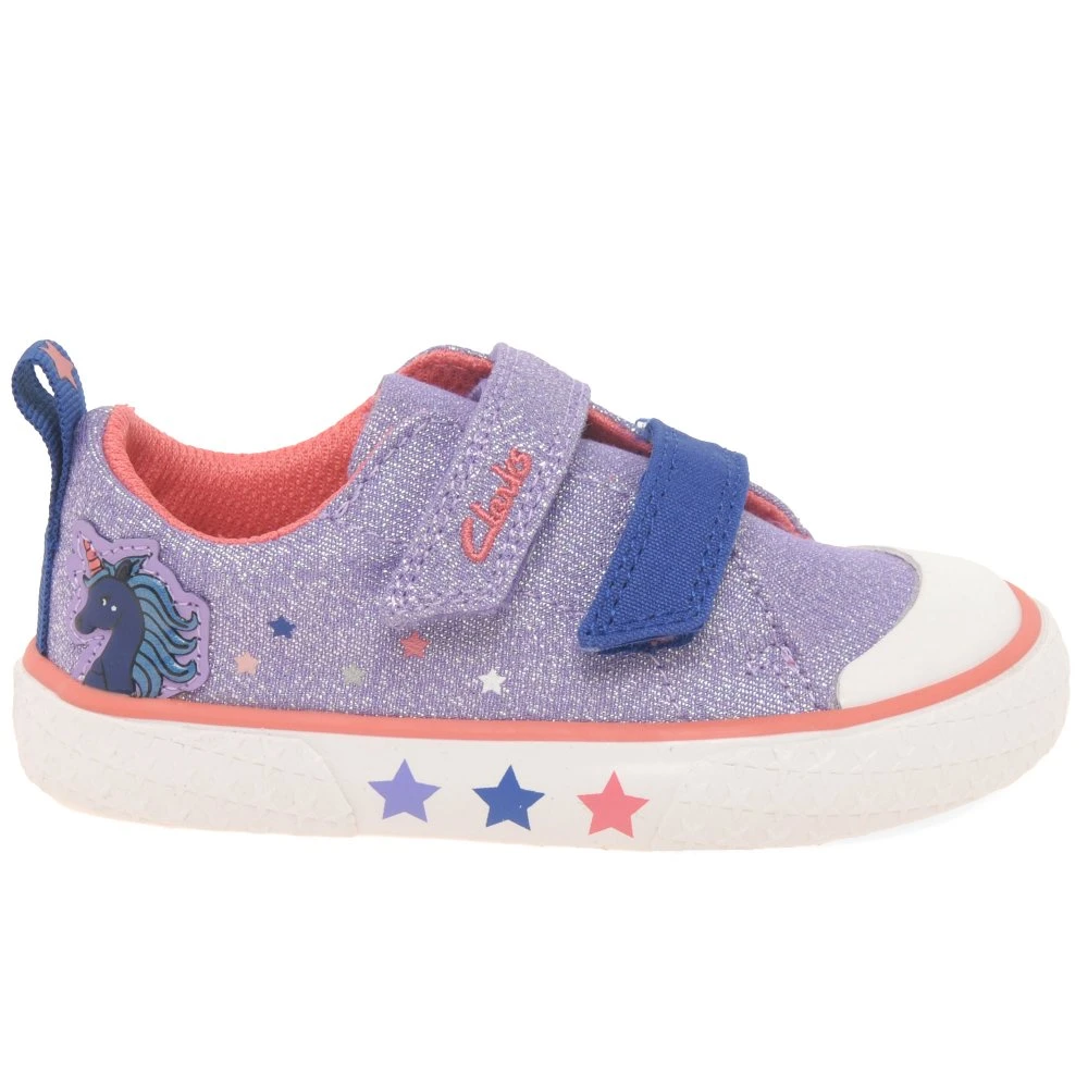 Perfect for casual wear in their spring summer wardrobe, the Clarks Foxing Play K Girls trainers, feature soft decorated canvas uppers. Keep feet secured with its dual rip-tape fastening for easy on/off during play days.