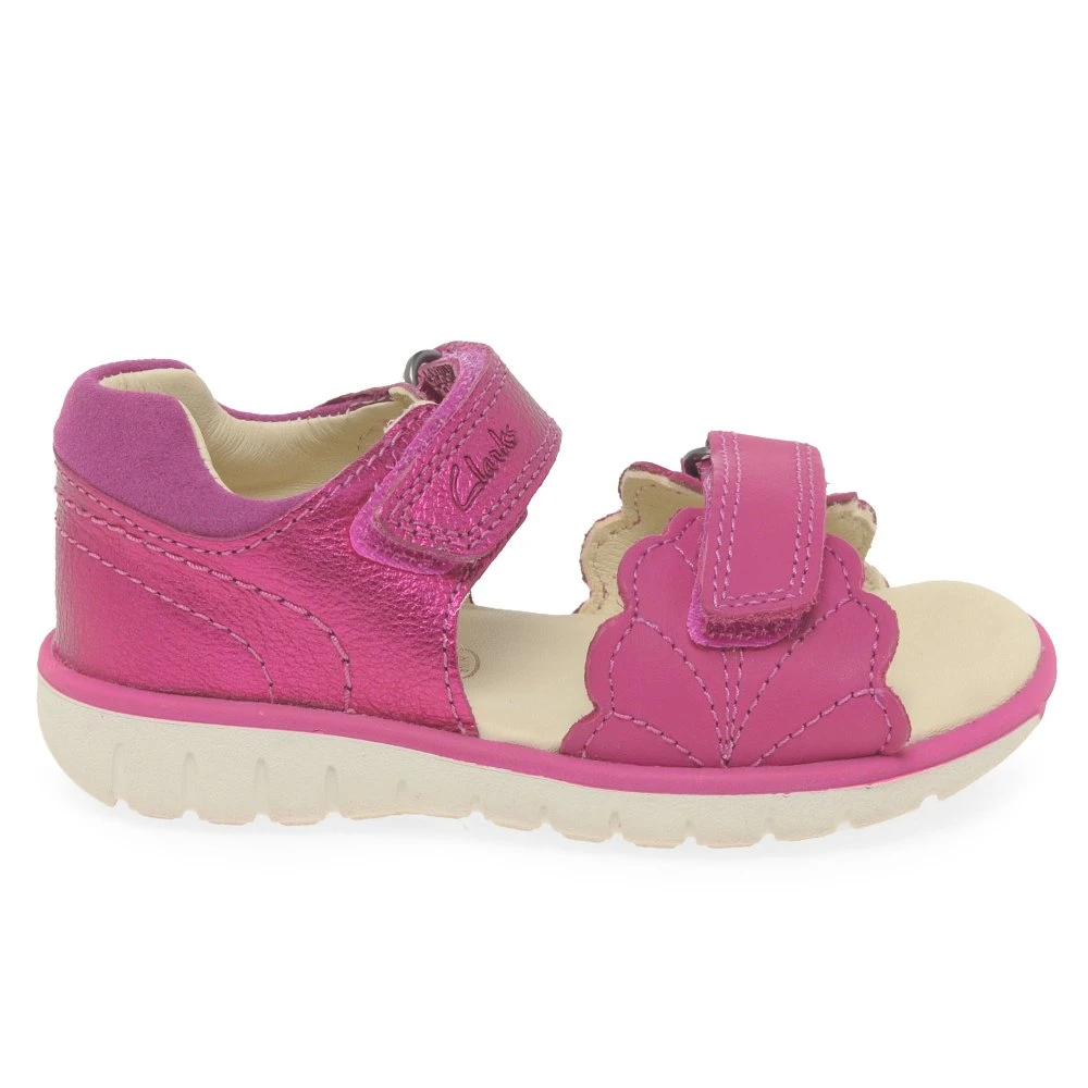 The Clarks Roam Wing T girls sandals are ideal for adventures on the beach. Featuring breathable leather uppers and linings, little feet can be secured with two adjustable rip tape fastenings for an easy on/off fit.Â