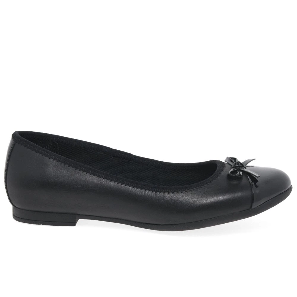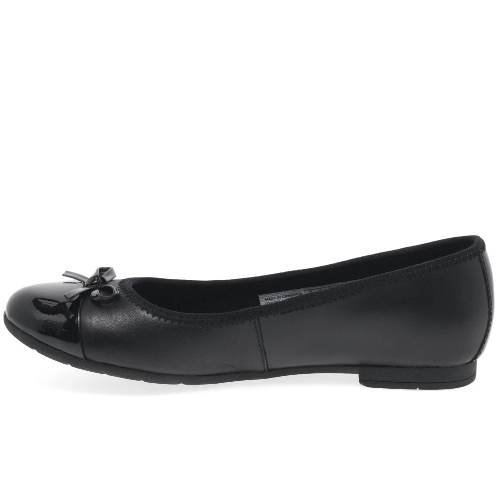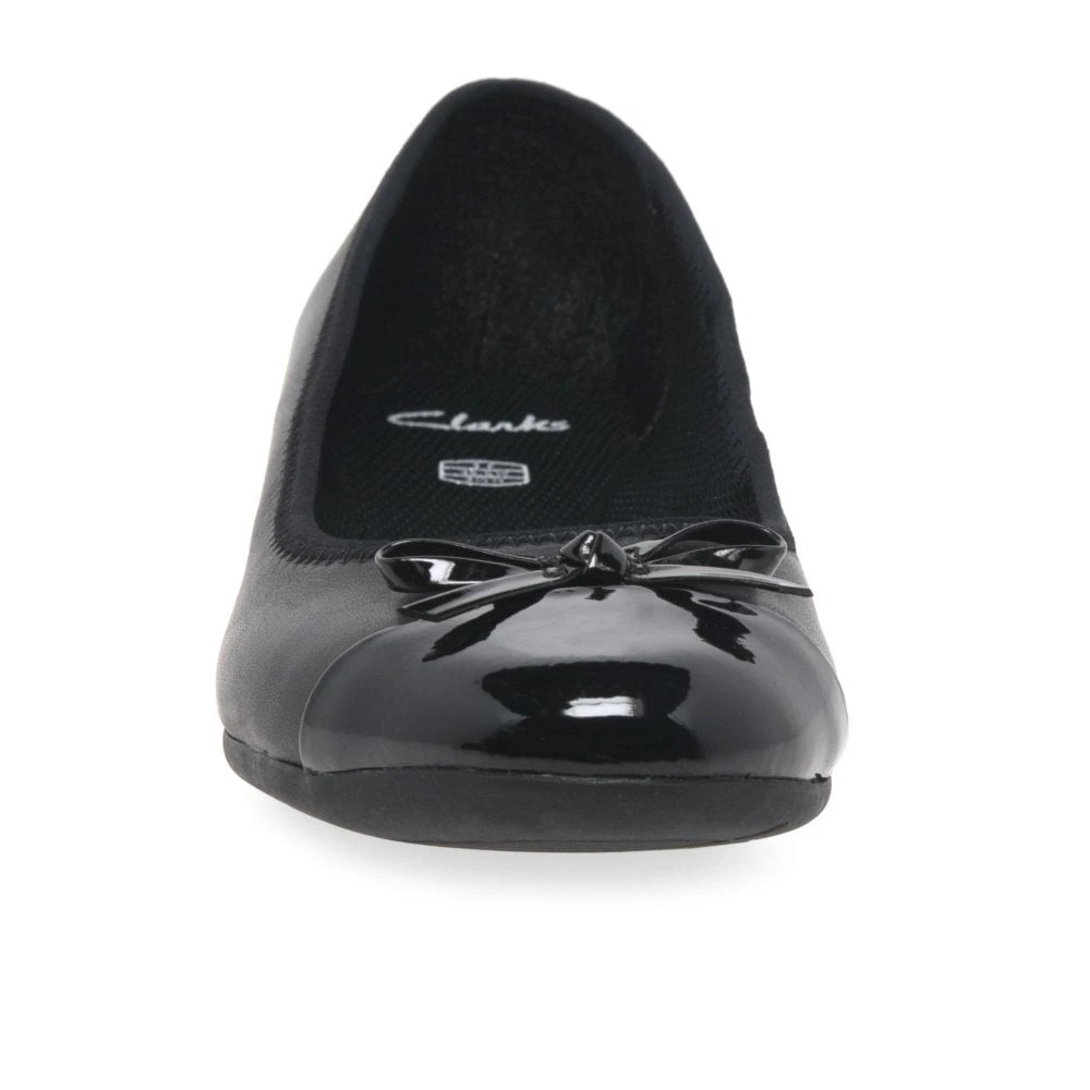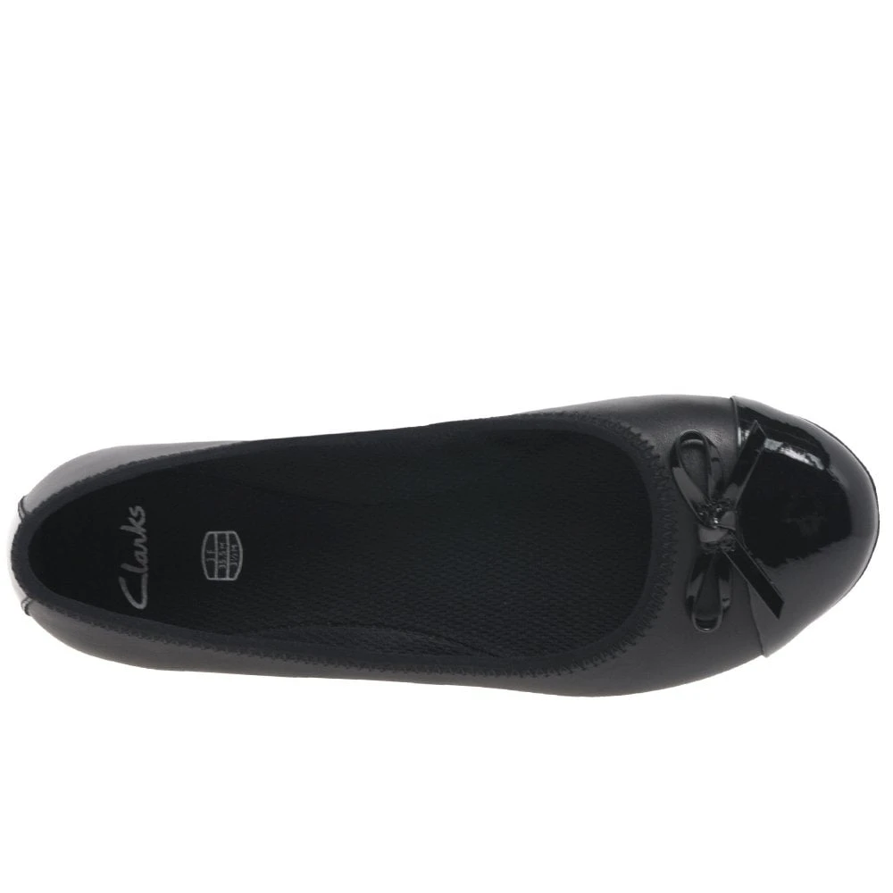 The Clarks Scala Bloom Y provide a smart and sophisticated look for younger girls, the ballet pump silhouette features premium leather uppers with patent toe cap detailing. A delicate bow sits atop, providing a dainty and feminine look throughout wear. The soft textile lining has been made from 50% recycled materials.Â