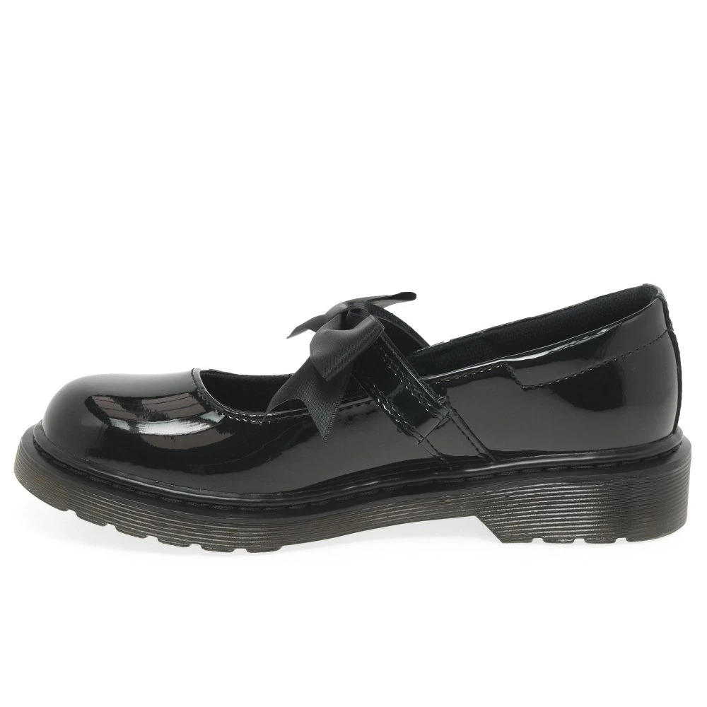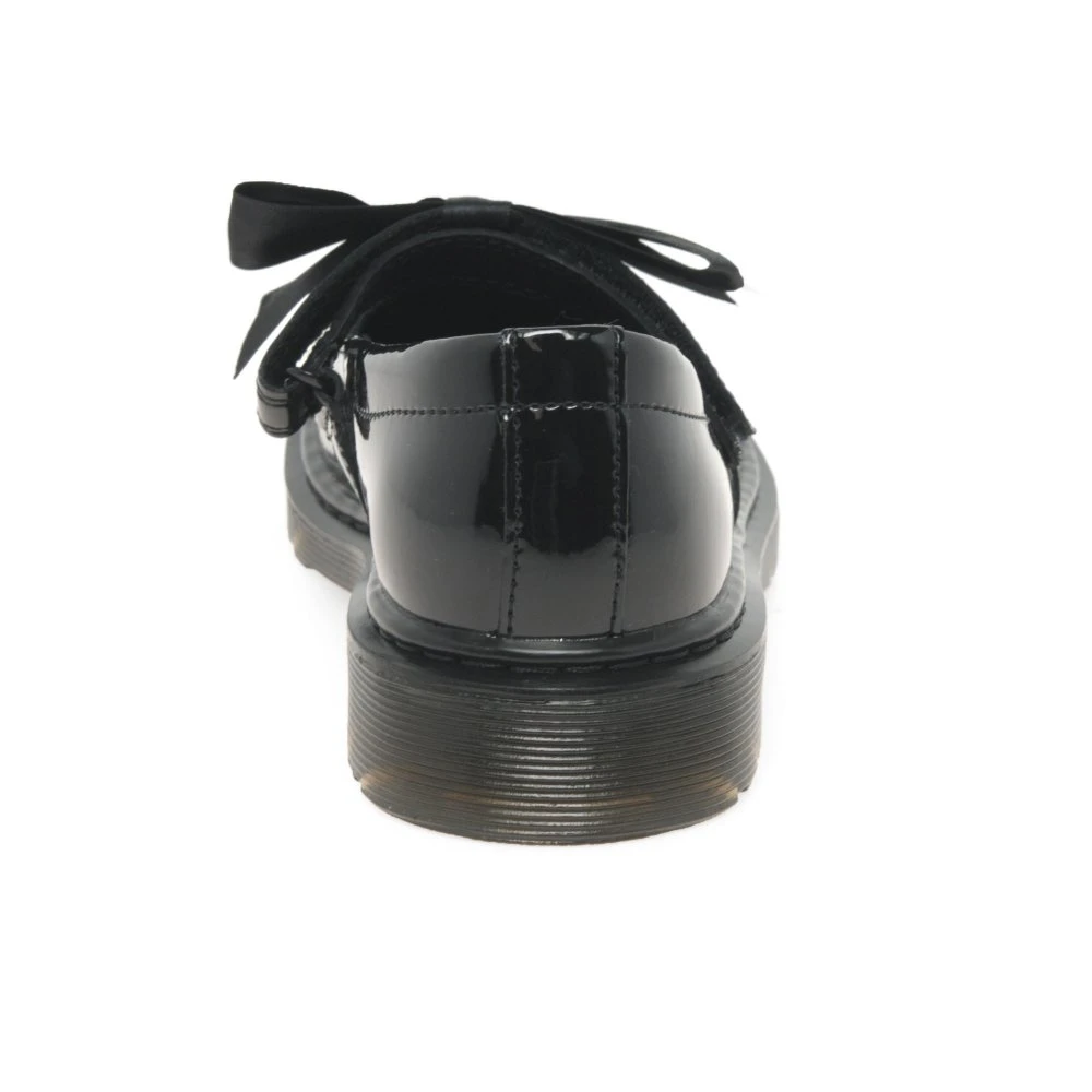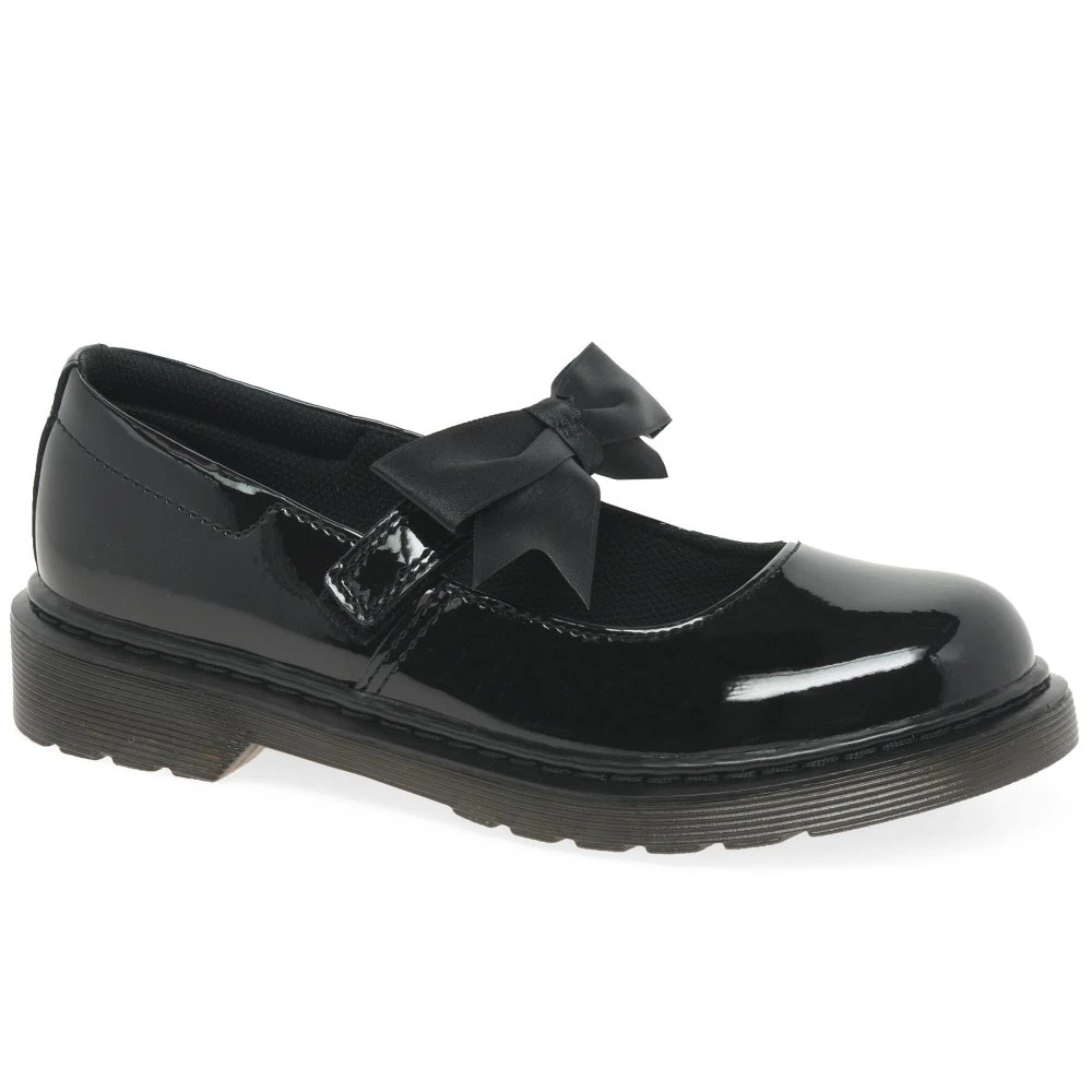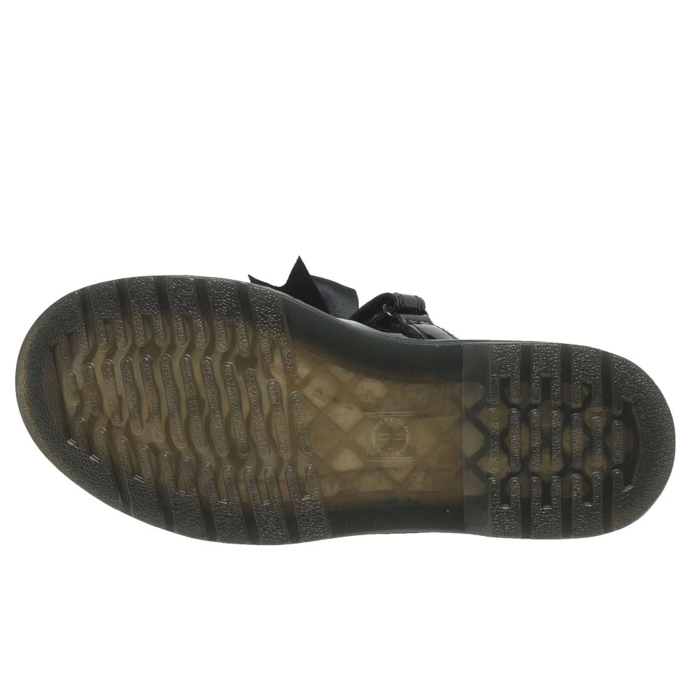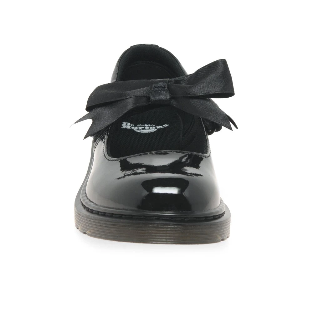 Stylish and protective, the Dr. Martens Maccy II junior school shoes are built with shiny patent uppers and classic Airwair thick soles. Secure with rip tape fastenings and enjoy a silk bow trim.Â