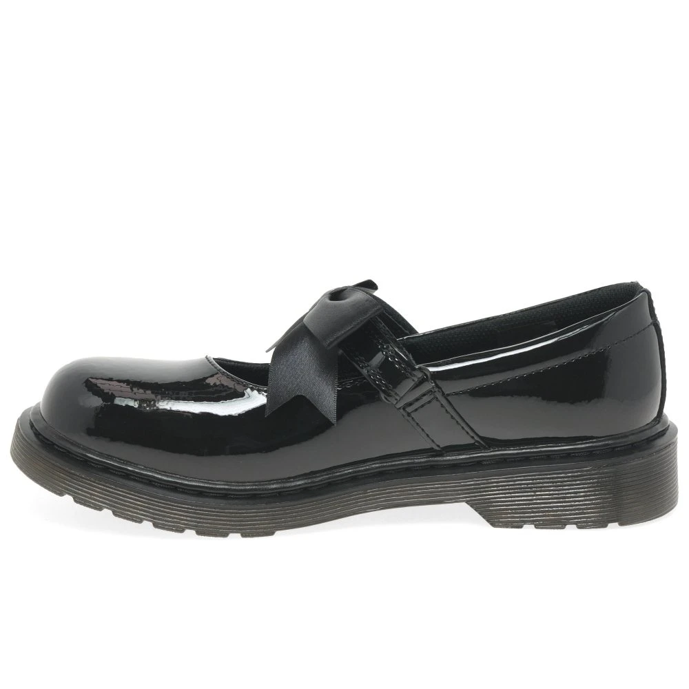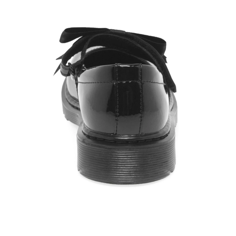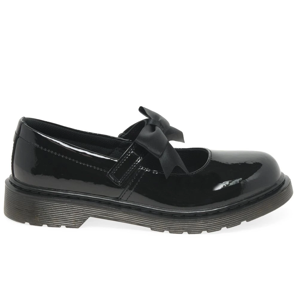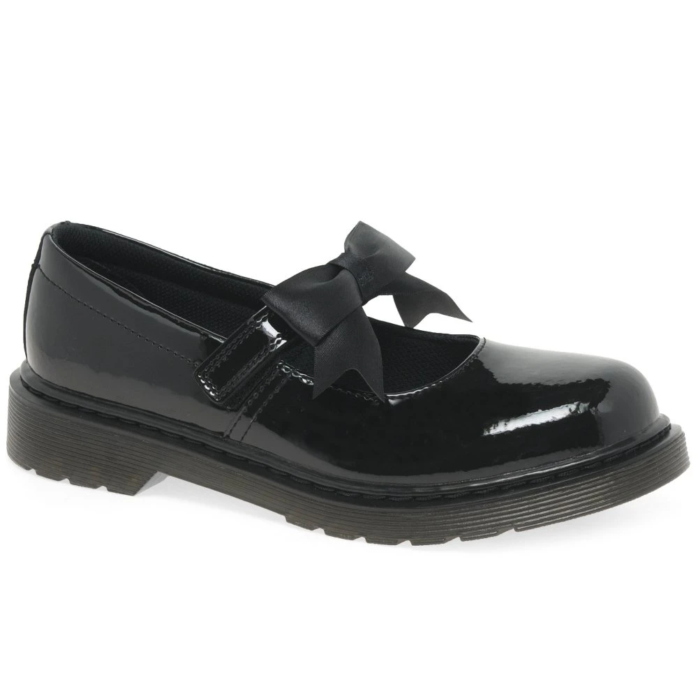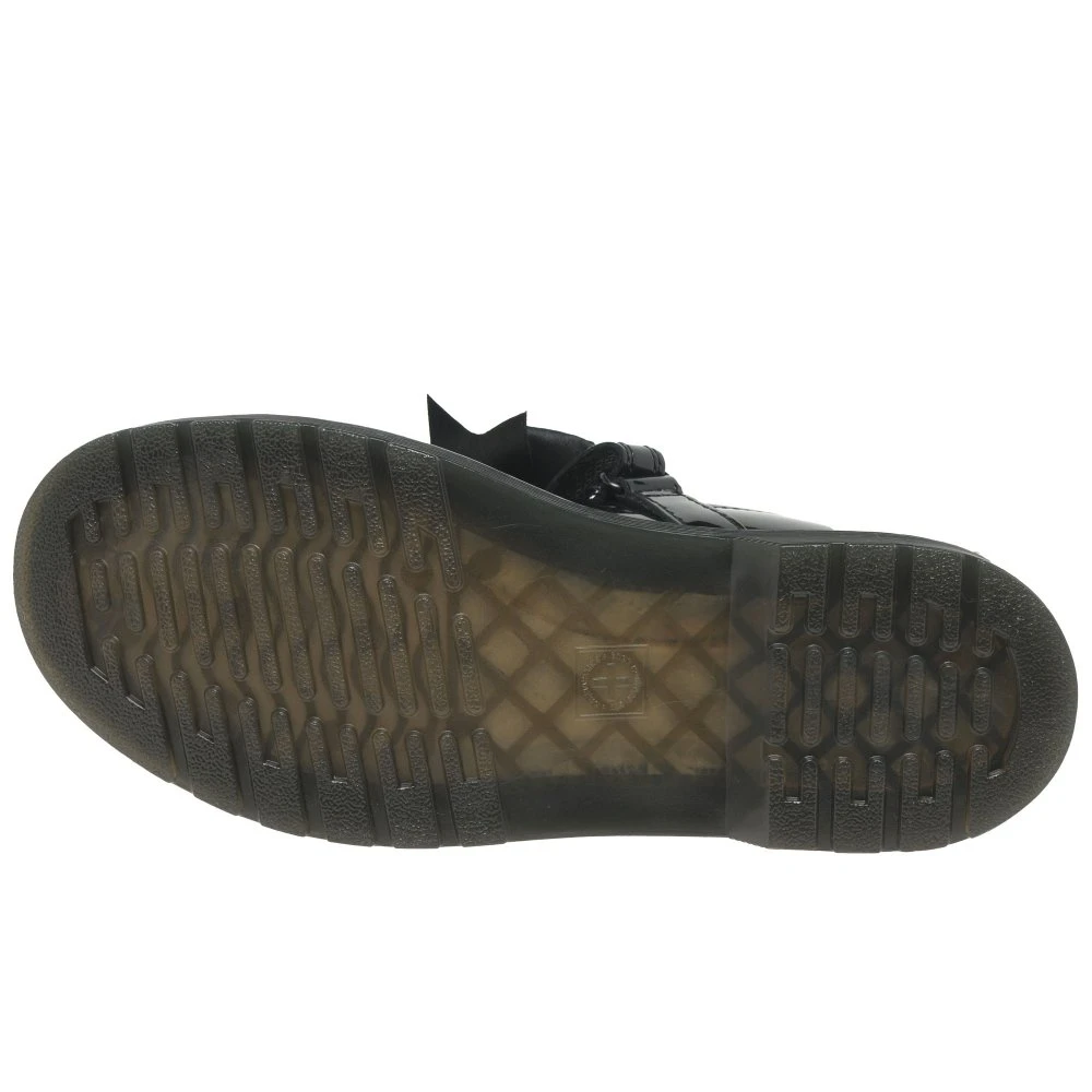 Senior school shoes crafted from quality patent leather, the Dr. Martens Maccy II feature rip tape fastenings with silk bow trim adding a girly edge to these practical shoes.