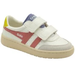 The Gola Falcon Strap trainer for kids has an 80% recycled PU upper. Featured here in coral pink and sulphur yellow, this girls’ trainer option draws on Gola’s ‘80s court sport roots and is finished with hook and loop fastening.