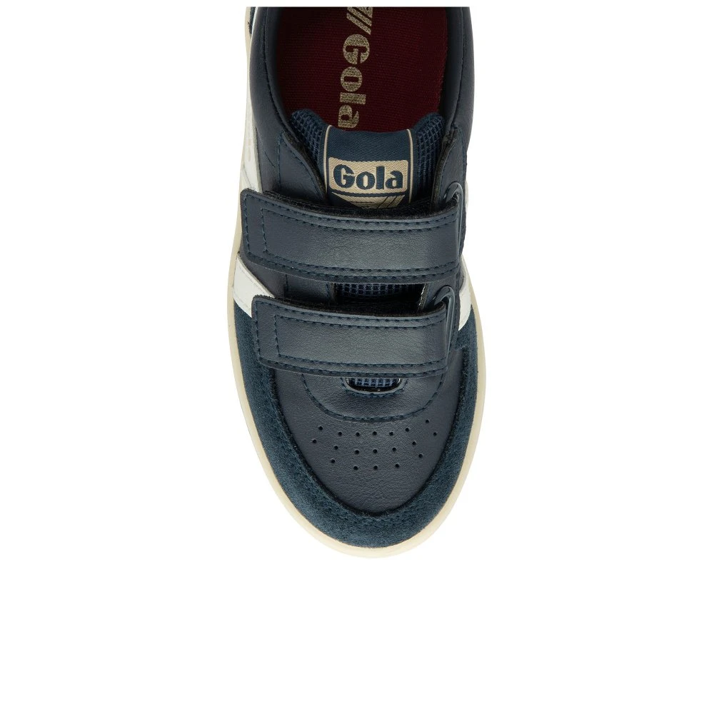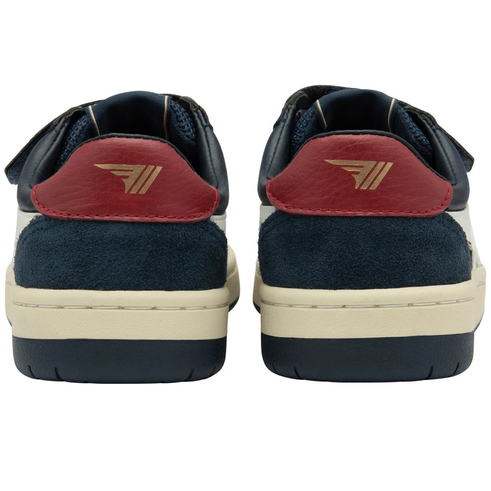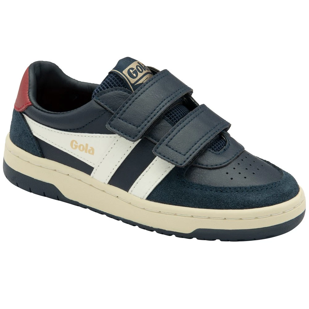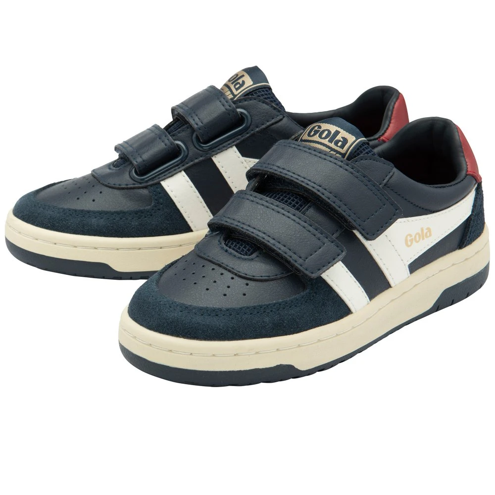 Hawk for kids’ is a new addition to the Gola Classics children’s trainer collection. A court-sport inspired trainer silhouette with an 80% recycled main body PU upper and featured here in evergreen with off white and sun trims. Finished with a super easy to use hook and loop fastening.