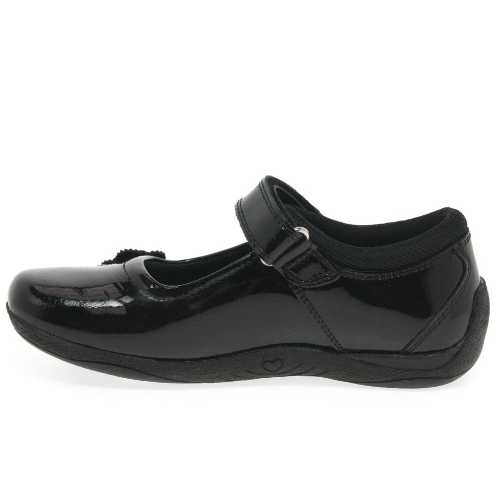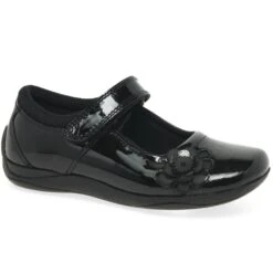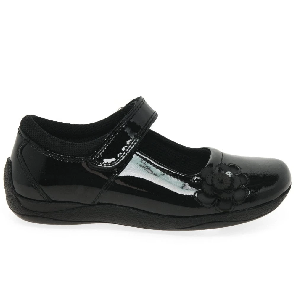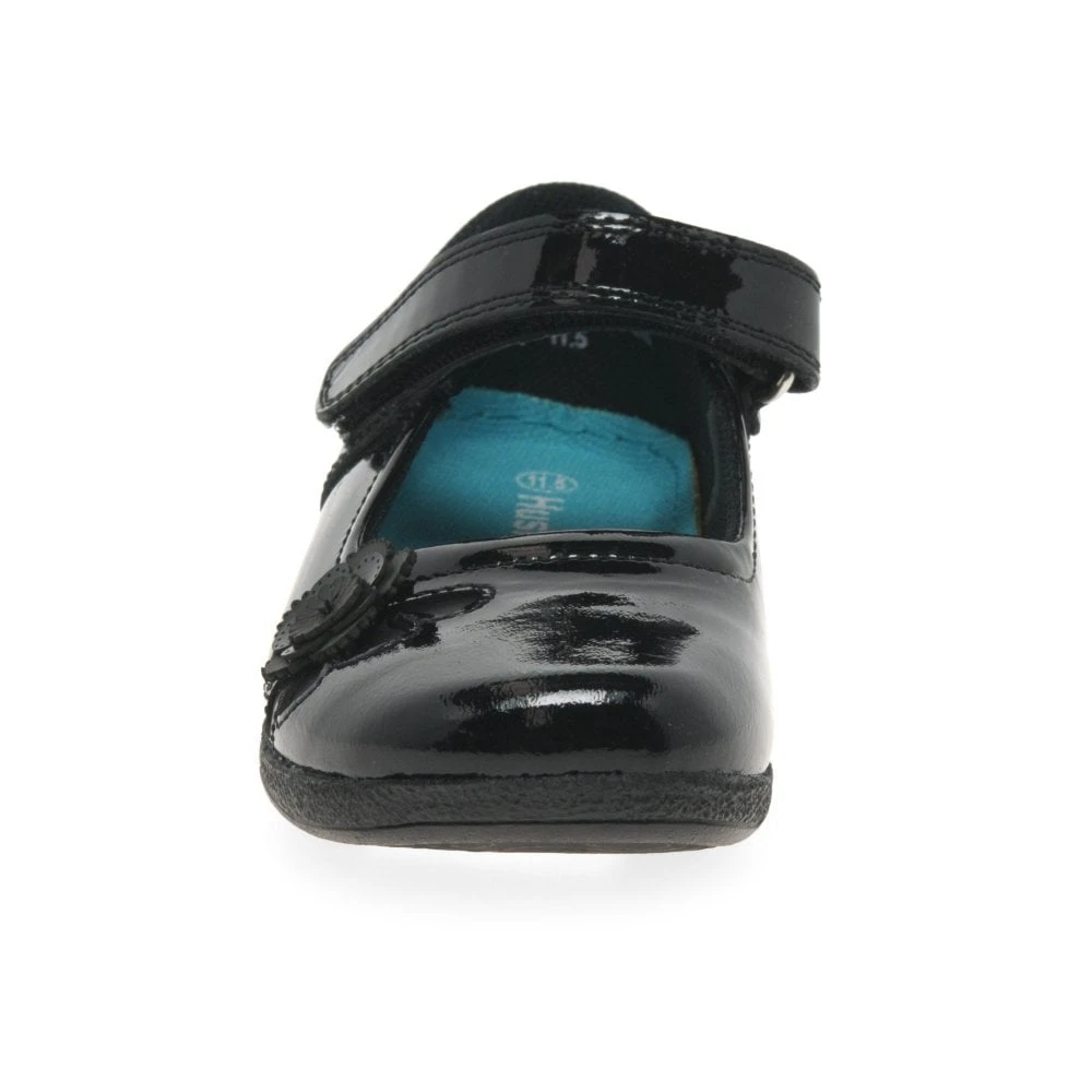 The Hush Puppies Jessica follows the Mary Jane shoe style silhouette as the rip tape fastening crosses over the upper arch of the foot. Support is given from both the rip tape fastening and padded ankle backing ensuing security and comfort is provided throughout wear. The leather uppers are glossy and smooth, as they sit atop the thick supportive sole of the shoe which wraps around the back heel of the school shoe.