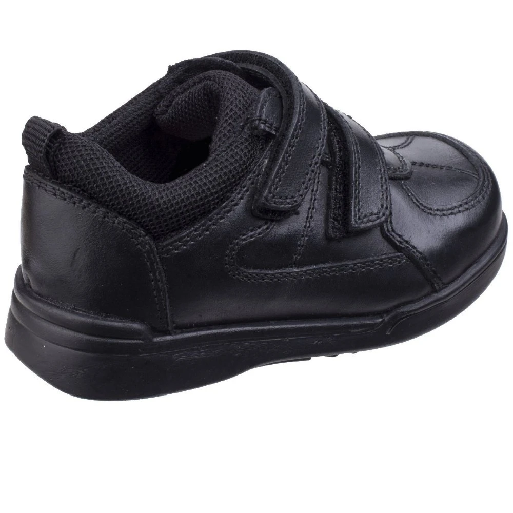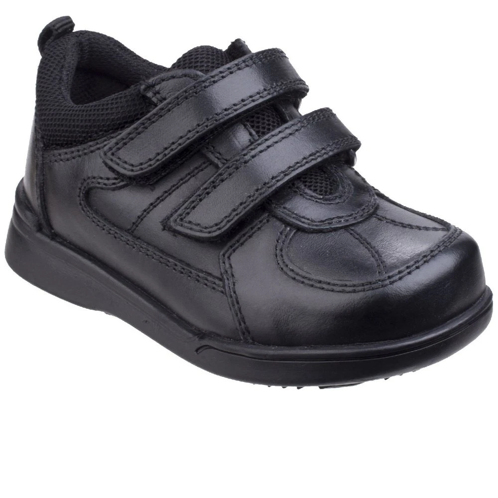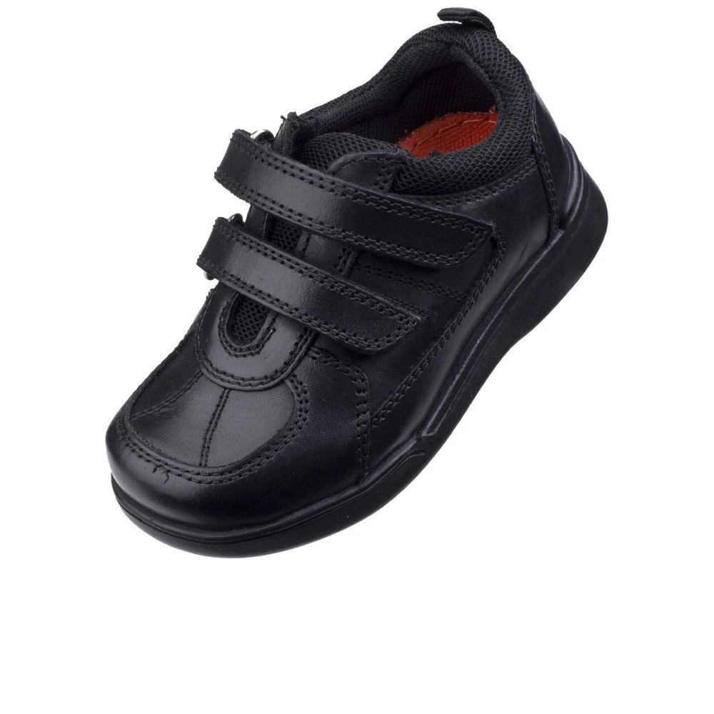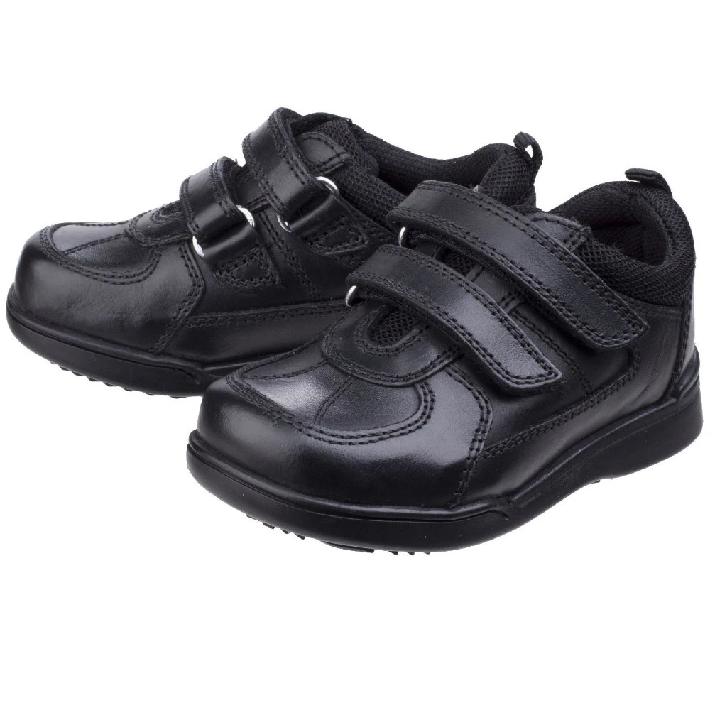 Durable boys school shoe with double touch strap fastening and adjustable fit left, fit right in soles for the perfect fit. A padded collar adds even more comfort.