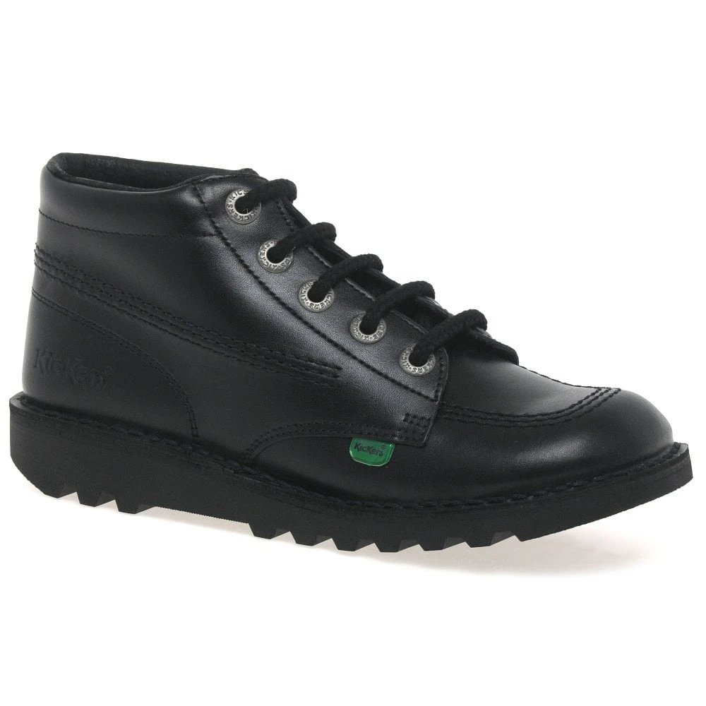 The Kickers Chi senior girls’ hi-top shoes are a black leather or patent pair that are ideal for school.