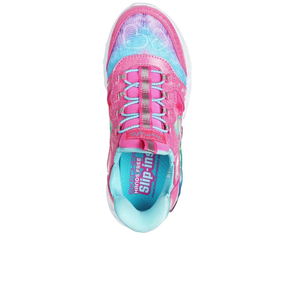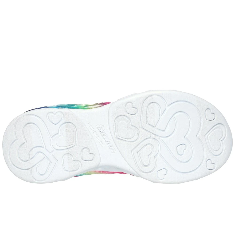 Sparkle and shine in magical delight wearing Skechers Hands Free Slip-ins Heart Lights: Infinite Heart Lights. This Slip-ins light-up design features a heart print ombre mesh upper with synthetic glitter overlays and fixed stretch laces