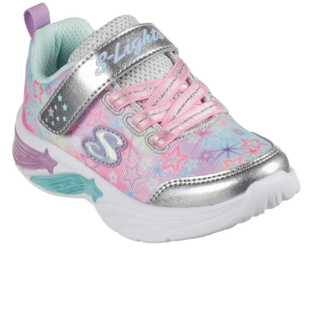 Light-up your steps in superstar style with Skechers S-Lights: Star Sparks. This sporty light-up design features a sparkle star print fabric and synthetic upper with stretch laces, plus on/off switch.