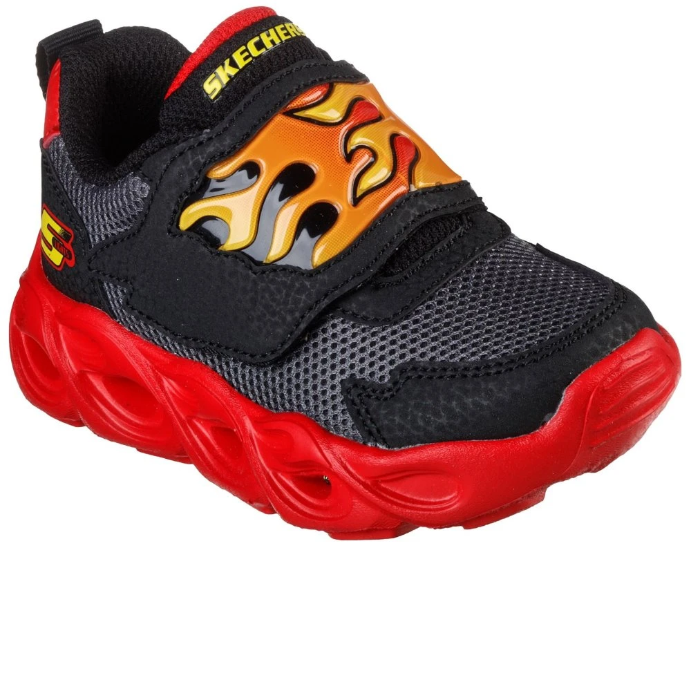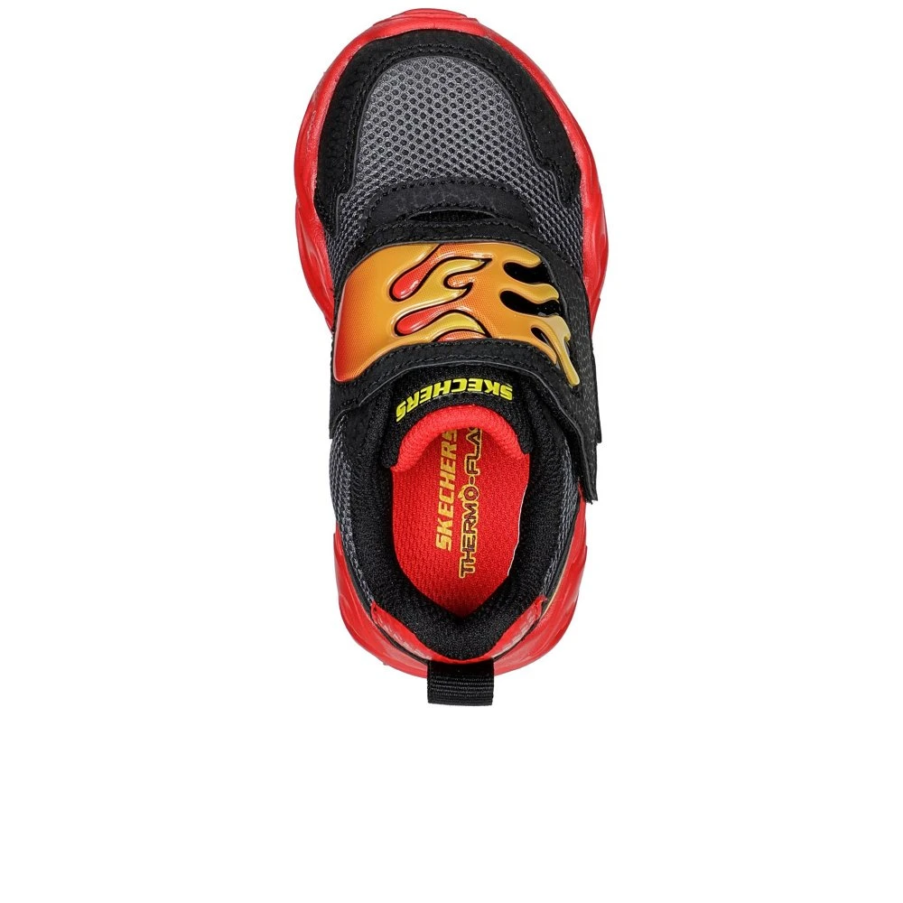 Take-off in hot style wearing the Skechers S-Lights: Thermo Flash – Flame Flow. This fiery themed light-up sporty design features a synthetic upper with a hook and loop strap closure and a cushioned midsole.