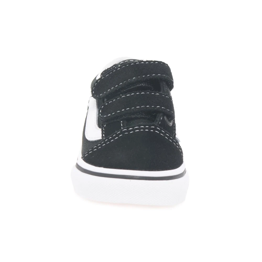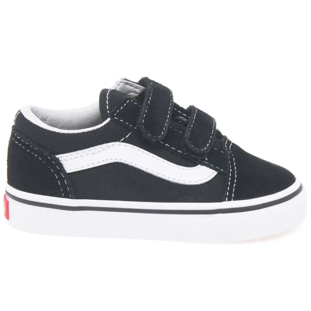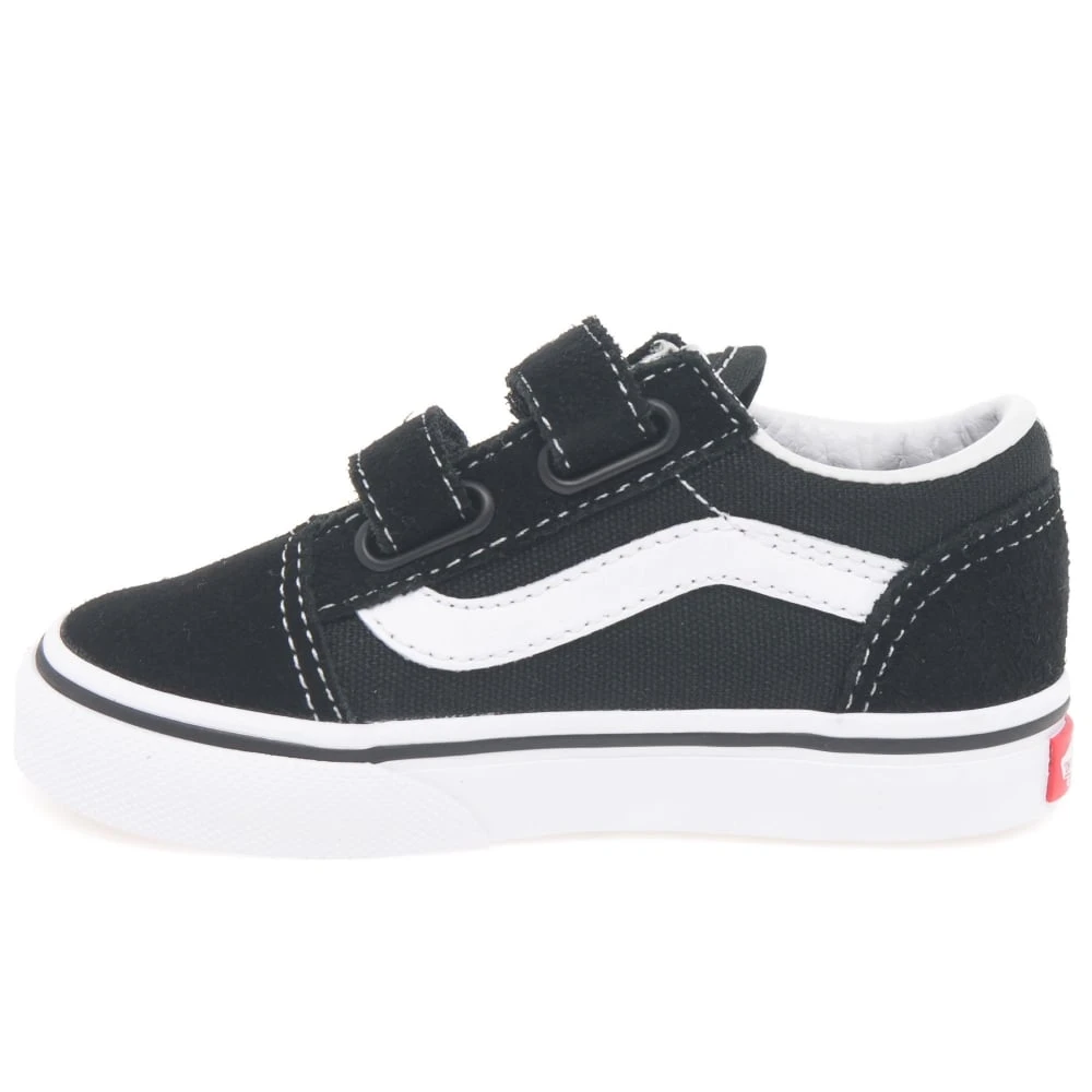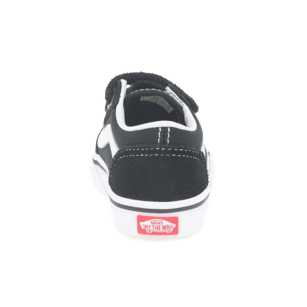 A mini take on a classic, the Vans Old Skool V Kids Toddler canvas shoes feature contrasting stitching and red branding on their heels and tongues, colour popping on an otherwise minimal monochrome design. Their rip tape fastening suede uppers feature white accents, and stand upon grip inducing rubber waffles soles.